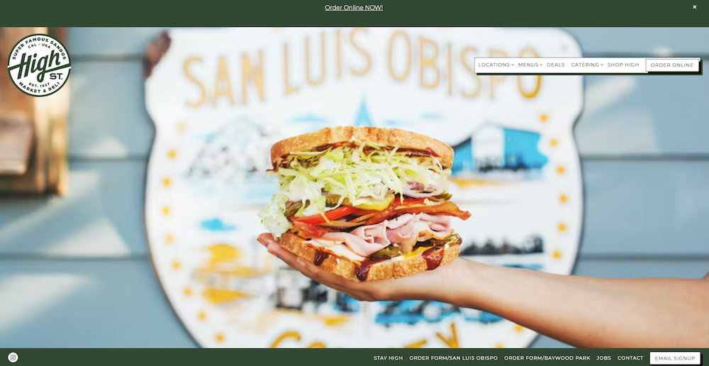 Life-sized photos of sandwiches, creatively designed menus, and a consistent color palette. High St. Deli serves as an excellent example for casual restaurant websites.