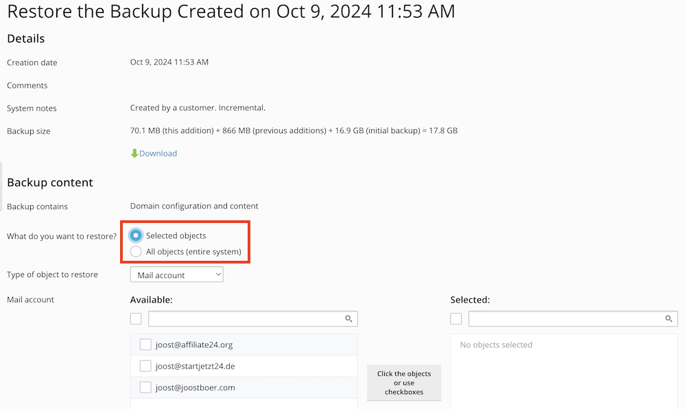 When you manage a single site, the simplest option is to just check All objects. Then, when you want to restore a backup of your website (but not, for example, your email inbox), choose the following settings and click Restore.