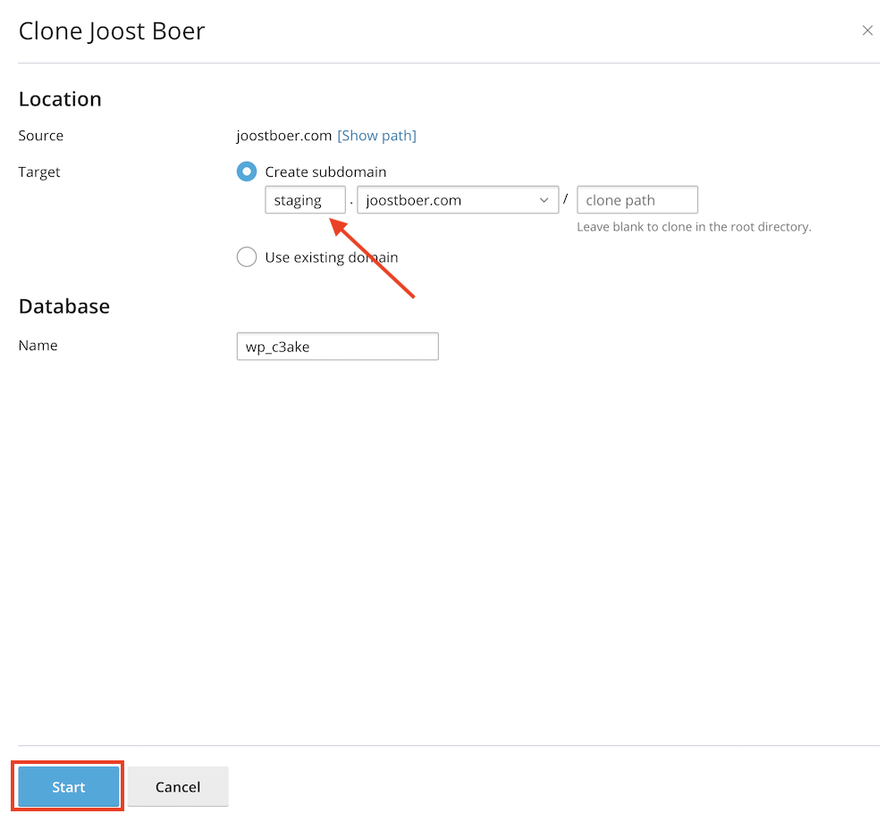 Give your staging site a name (if you really want to prevent people from finding your staging site, choose something less obvious than “staging”) and click on Start.