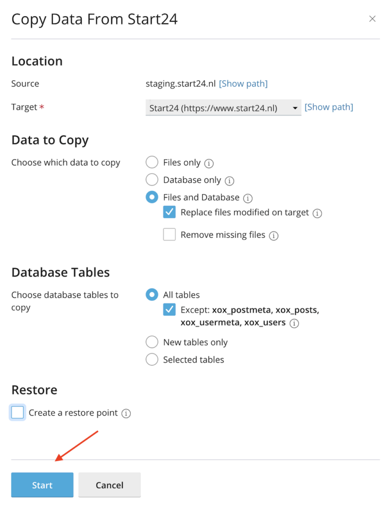 Something to pay attention to with Database Tables: by default, the articles and users from your staging site are not copied to your live site. This is because in many cases people continue to add and modify blog articles on their site. If you want the blog articles and users from your staging site to transfer to the live site, make sure that Except: xox… is not checked.