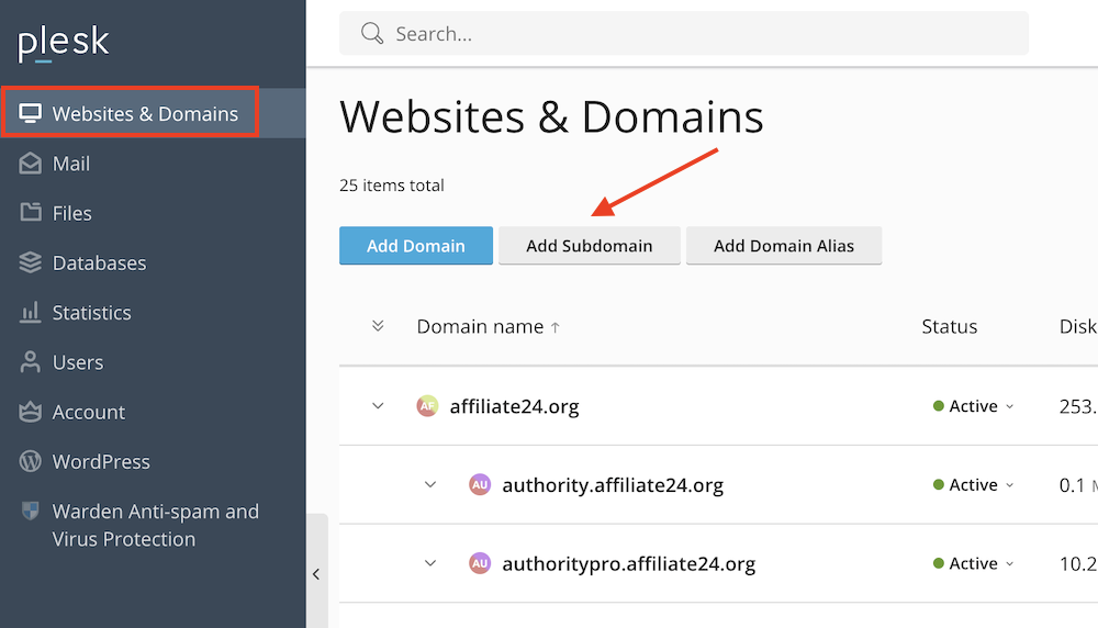 To do this, go to Websites & Domains in Plesk and navigate to Backup & Restore.