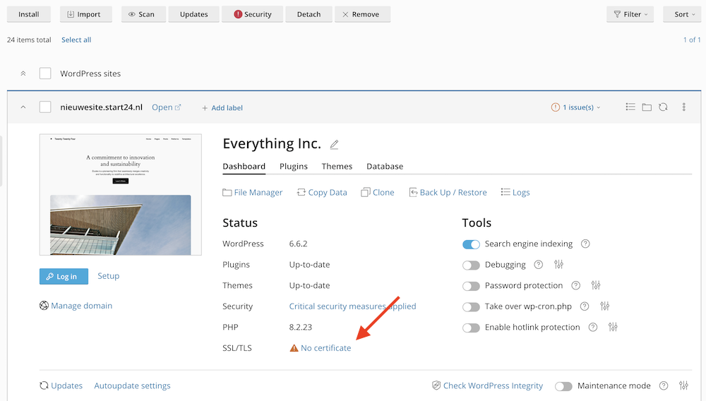 When software on your WordPress site is not up-to-date, this will be indicated under the Status section.