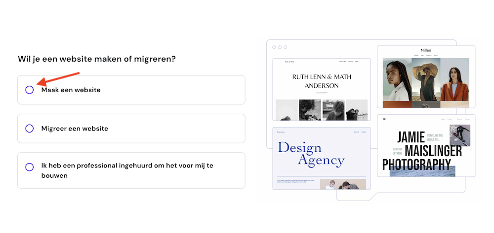 After you have completed your payment, you will be guided through a wizard that helps you create a starting point for your website and register a domain name.