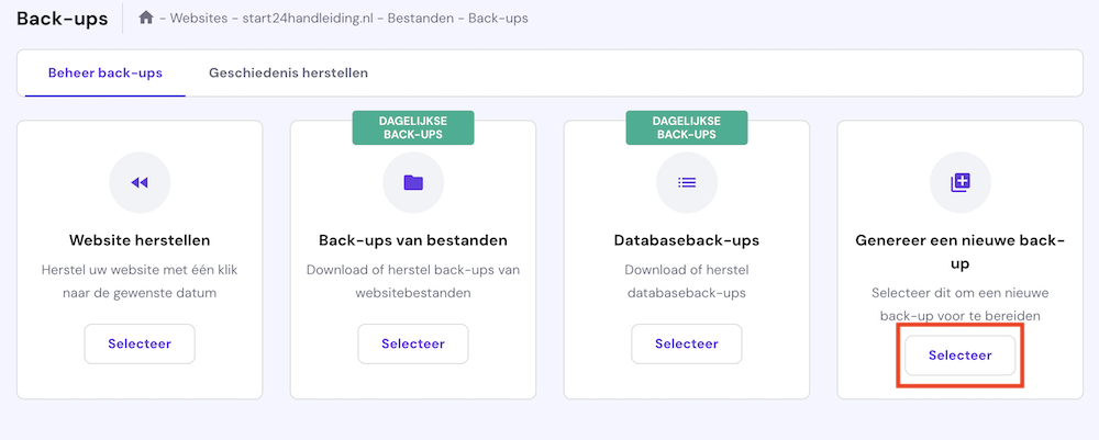 After that, click on Select at Website recovery, choose the backup you want to restore, and finally click on Restore.
