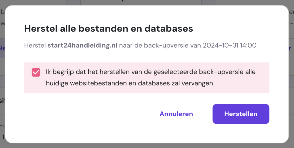 You can restore a manually created backup or an automatic backup at any desired moment. This is very useful if something has gone wrong with your website.