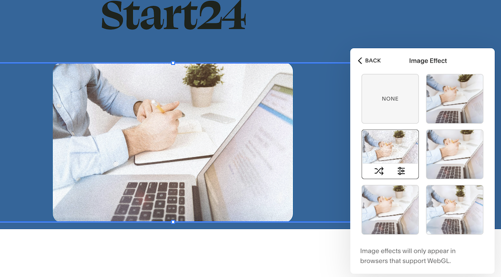 What I also found quite nice are the effects you can add to your images, such as a grainy film effect. This way, you can easily give your site a unique character.